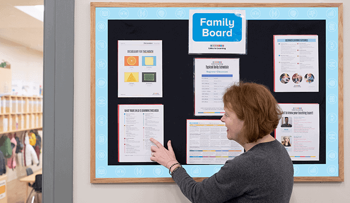 Family boards are a wealth of information. There you will find the weekly lesson plan and skill sheet, learning outcomes for the year, Spanish vocabulary we are working on, and more. It is a real-time way to keep up with what is happening in your child’s classroom.